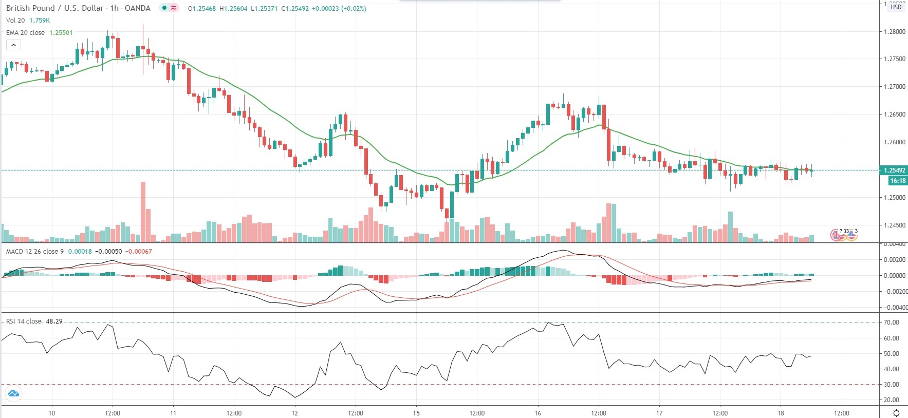 As of 6:40 GMT on Thursday GBP/USD was inching down 0.04% to trade at 1.2550, while moving within a narrow daily range of 1.2526-1.2567. The major pair has gained 0.08% so far this week, following a 1.01% drop in the business week ended on June 12th.