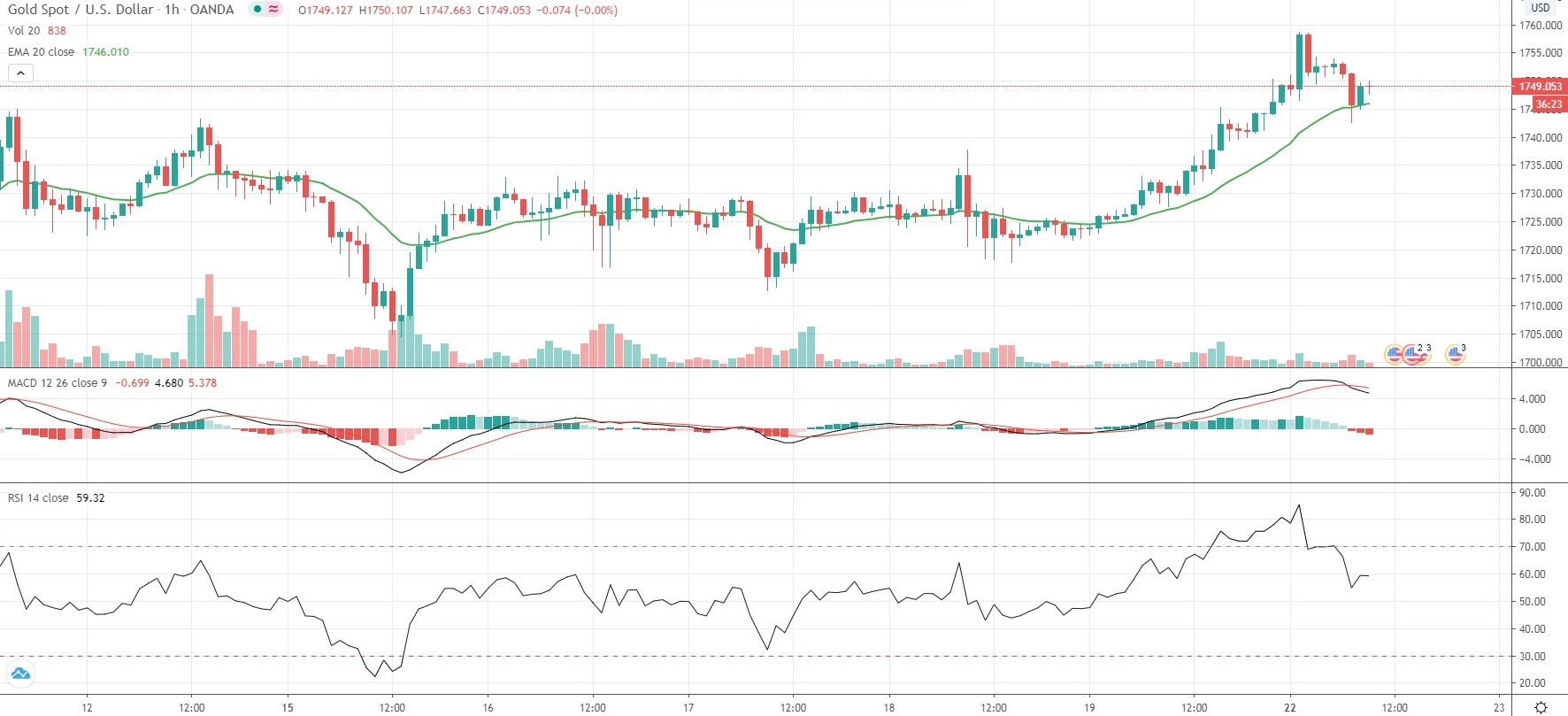 As of 9:32 GMT on Monday Spot Gold was edging up 0.24% to trade at $1,748.31 per troy ounce, after earlier touching an intraday high of $1,758.68, or a price level not seen since May 18th ($1,765.26). Meanwhile, Gold futures for delivery in August were gaining 0.48% on the day to trade at $1,761.35 per troy ounce, while Silver futures for delivery in July were up 1.18% to trade at $18.058 per troy ounce.