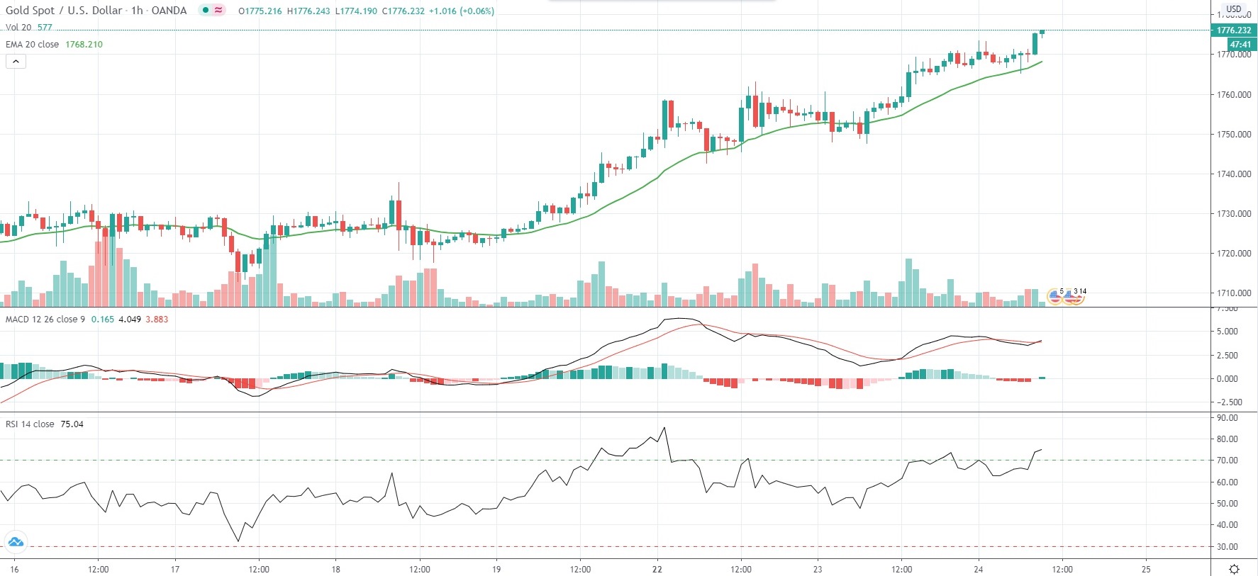 As of 9:34 GMT on Wednesday Spot Gold was gaining 0.50% to trade at $1,776.52 per troy ounce, after earlier touching an intraday high of $1,777.41, or a price level not seen since October 9th 2012 ($1,779.82). Meanwhile, Gold futures for delivery in August were gaining 0.60% on the day to trade at $1,792.75 per troy ounce, while Silver futures for delivery in July were up 0.06% to trade at $18.073 per troy ounce.