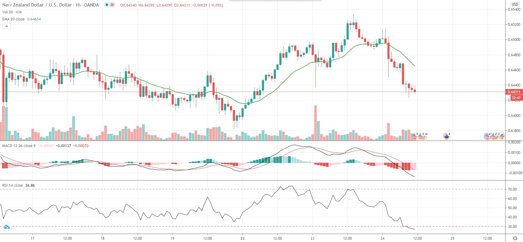 As of 11:42 GMT on Wednesday NZD/USD was retreating 0.99% to trade at 0.6427, after touching an intraday low of 0.6423 in mid-European session, or a level not seen since June 22nd (0.6382). The major pair has trimmed earlier gains, being up 0.38% so far this week, following two successive weeks of losses.