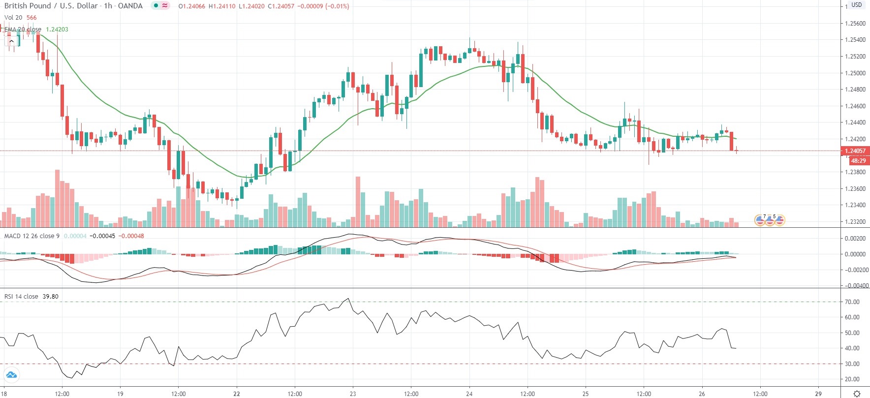As of 7:14 GMT on Friday GBP/USD was edging down 0.15% to trade at 1.2401, after earlier touching an intraday low of 1.2398, or a level not far from Thursday’s low. The major pair has trimmed gains for the current week, now being up 0.43%, following two successive weeks of losses.