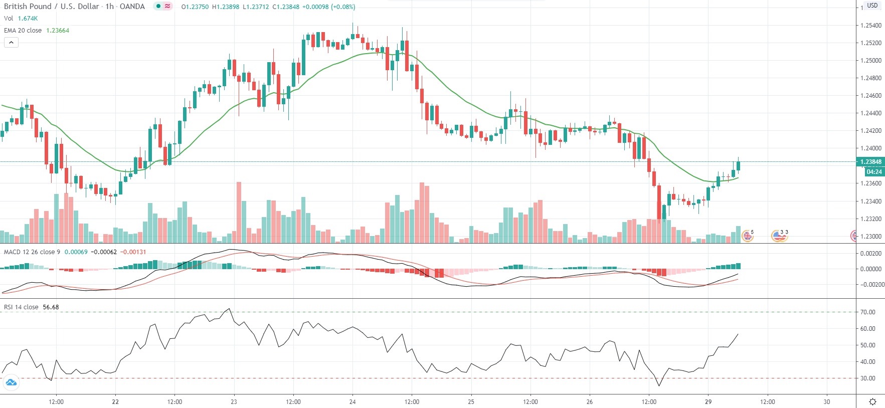 As of 6:54 GMT on Monday GBP/USD was edging up 0.38% to trade at 1.2383, bouncing from Friday’s one-month low of 1.2315. The major pair dipped 0.10% last week, extending losses from the previous two weeks.