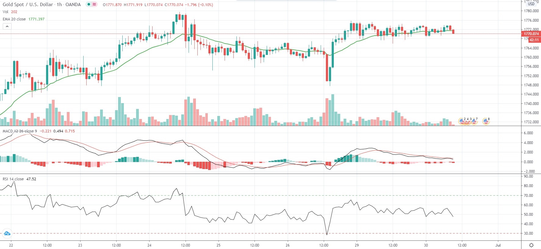 As of 9:35 GMT on Tuesday Spot Gold was inching down 0.10% to trade at $1,770.90 per troy ounce, while moving within a daily range of $1,768.84-$1,773.86. Still, it was in proximity to last Wednesday’s multi-month high of $1,779.45. The yellow metal was poised to register its best quarterly performance since 2016 in Q2, being up nearly 12%.
