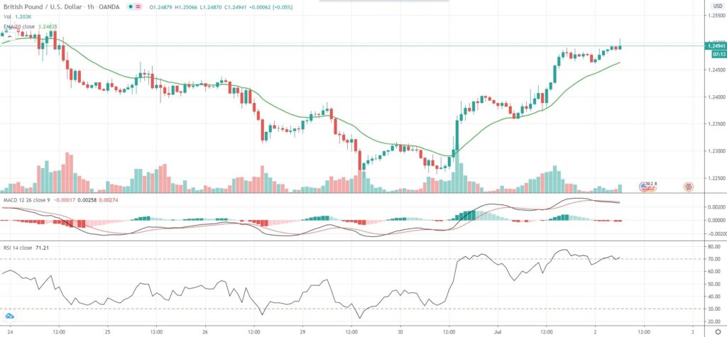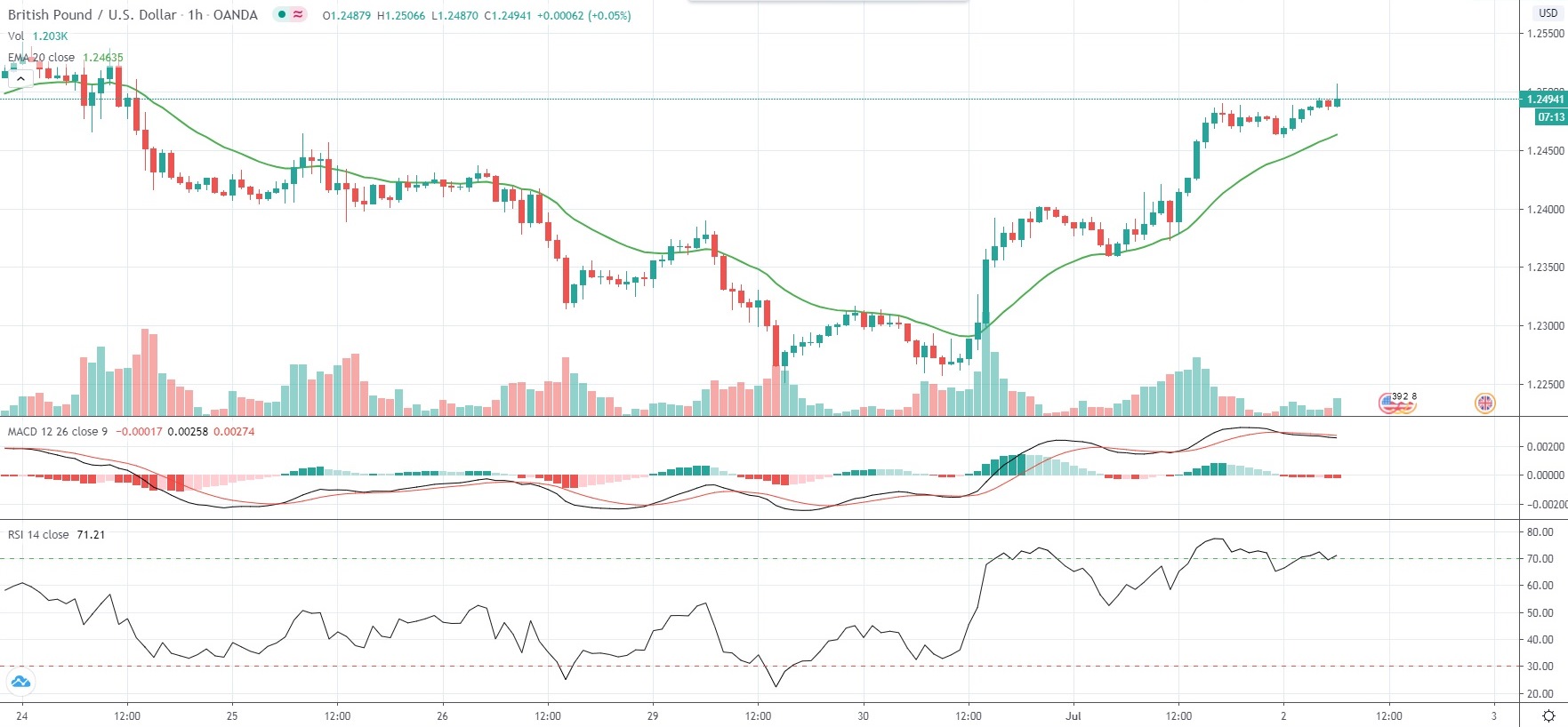 As of 6:54 GMT on Thursday GBP/USD was edging up 0.17% to trade at 1.2496, after earlier touching an intraday high of 1.2507, or a level not seen since June 24th (1.2543). The major pair has advanced 1.28% so far this week, following three successive weeks of losses.