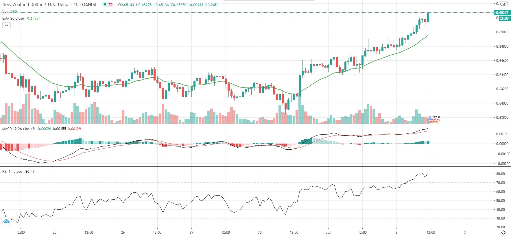 As of 11:37 GMT on Thursday NZD/USD was gaining 0.78% to trade at 0.6528, after earlier touching an intraday high of 0.6529, or a level not seen since June 23rd (0.6533). The major pair has erased earlier losses and is now up 1.65% for the current week, following another 0.25% gain in the preceding week.