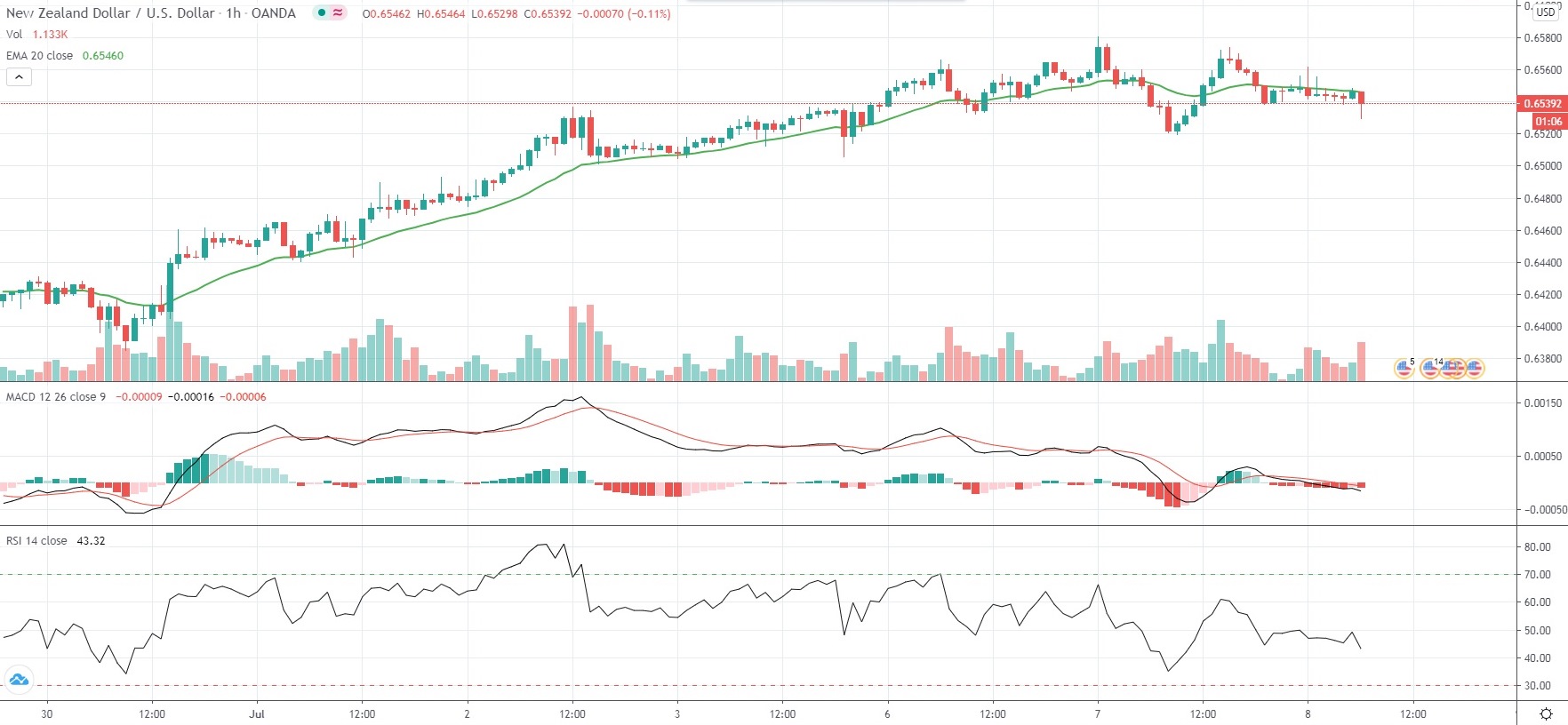 As of 6:49 GMT on Wednesday NZD/USD was edging down 0.10% to trade at 0.6540, after touching an intraday high of 0.6562 during early Asian session, or a level not far from Tuesday’s one-month high. The major pair has trimmed gains for the current week, now being up 0.12%, after gaining 1.72% last week – its best performance since the business week ended on June 5th.