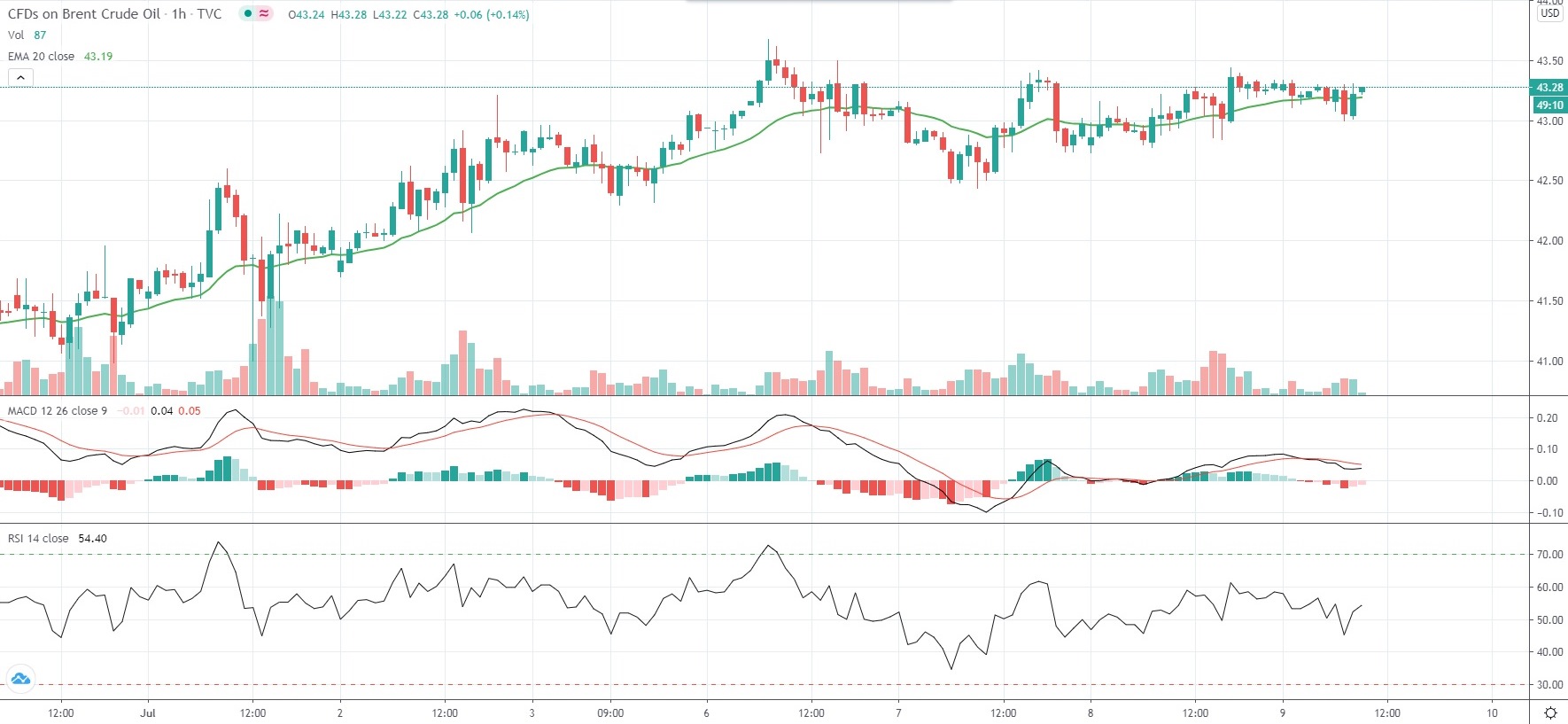 Brent Oil Futures were edging down 0.12% on the day to trade at $43.26 per barrel, while moving within a daily range of $43.04-$43.34. Brent Oil Futures have risen 1.36% so far this week, following a 5.06% surge in the prior week.