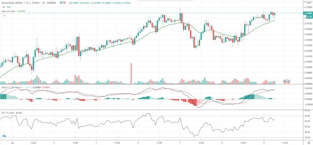 As of 6:54 GMT on Thursday AUD/USD was edging up 0.12% to trade at 0.6989, after touching an intraday high of 0.6995 during early Asian session, or a level not seen since July 7th (0.6998), also a one-month high. The major pair has gained 0.68% so far this week, following a 1.10% advance in the prior week.