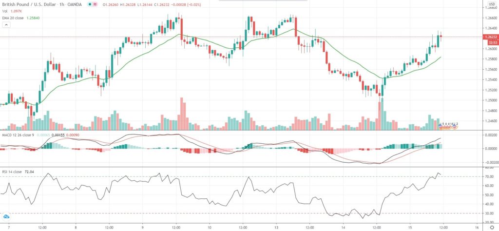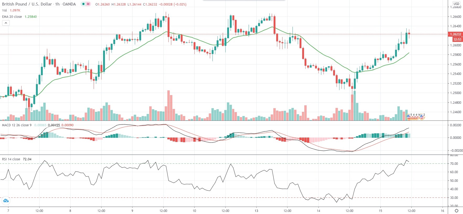 As of 11:35 GMT on Wednesday GBP/USD was gaining 0.58% to trade at 1.2626, after earlier touching an intraday high of 1.2635, or a level not seen since July 13th (1.2666). The major pair has trimmed earlier losses, now being down 0.02% so far this week, following two consecutive weeks of gains.