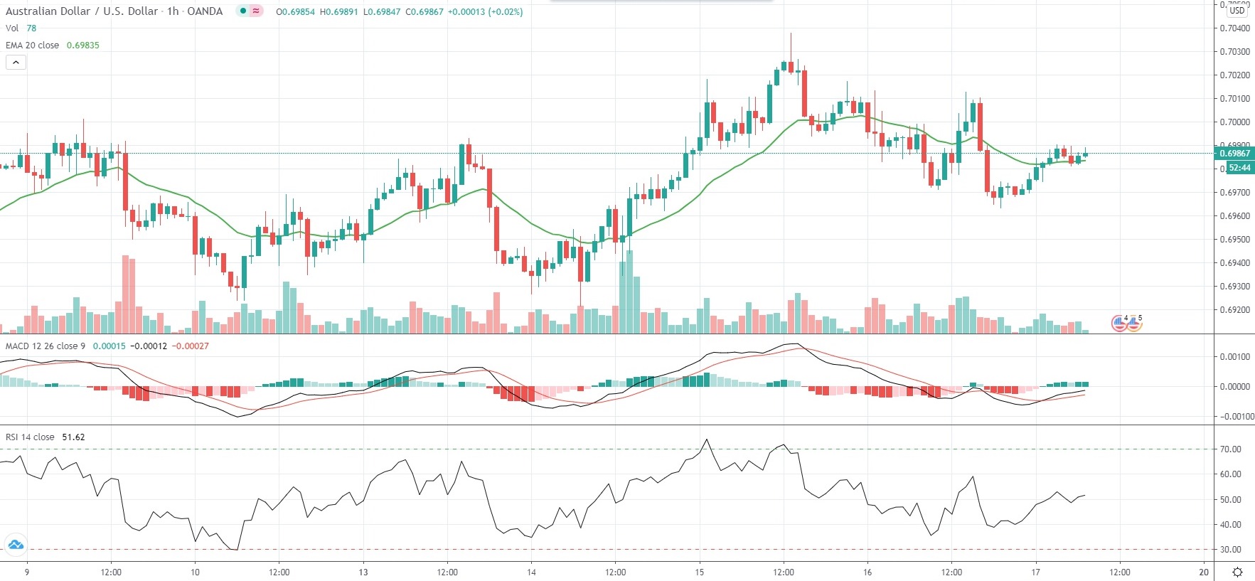 As of 6:55 GMT on Friday AUD/USD was edging up 0.20% to trade at 0.6986, as it moved within a daily range of 0.6968-0.6990. The major pair has risen 0.52% so far this week, while being set to record its fourth week of gains in a row.