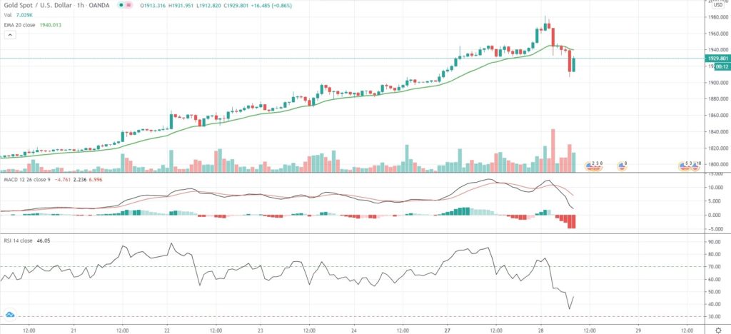 As of 9:17 GMT on Tuesday Spot Gold was losing 0.56% to trade at $1,931.11 per troy ounce, after earlier touching an intraday high of $1,981.36, a fresh all-time high. The precious metal soared 5.06% last week, which marked its best performance since the business week ended on March 27th. Gold was also set to register its best month since June 2016.