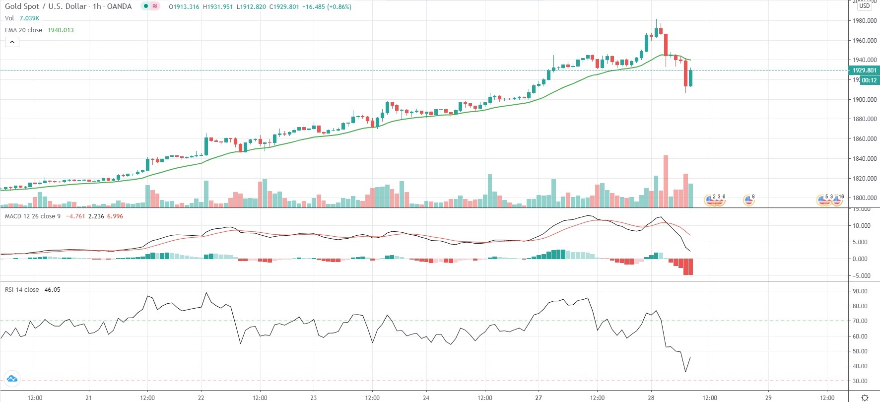 Having advanced to a fresh record high level of $1,981.36 per troy ounce earlier on Tuesday, Spot Gold pulled back as some market players took profits, while the US Dollar rebounded from lows not seen since June 2018.