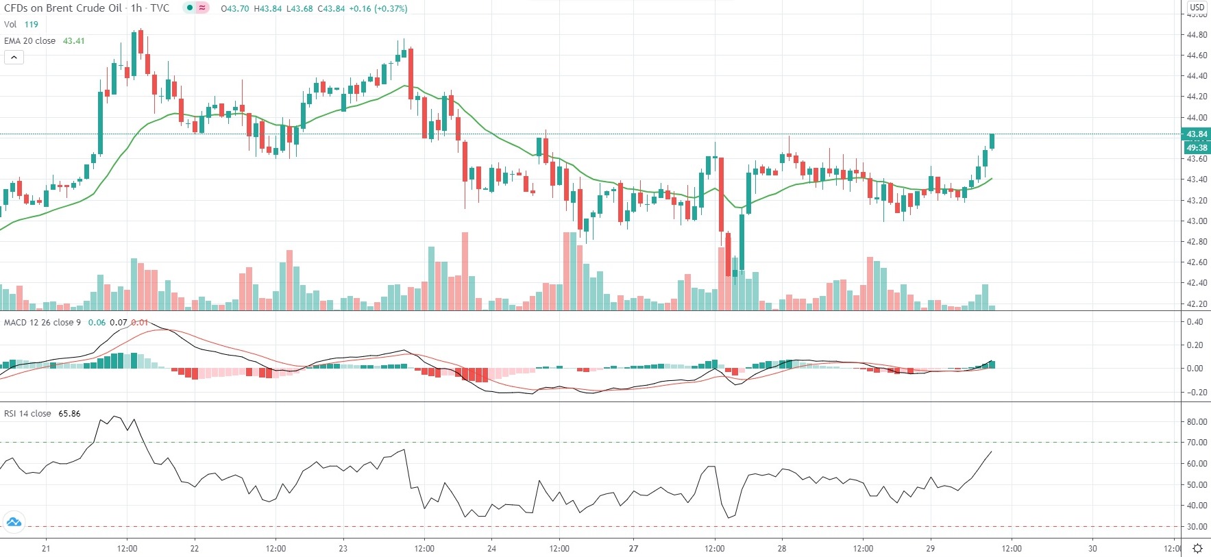 Brent Oil Futures were gaining 1.23% on the day to trade at $43.78 per barrel, while moving within a daily range of $43.22-$43.84. Brent Oil Futures have risen 1.14% so far this week and are also set to register their fourth consecutive month of advance in July.