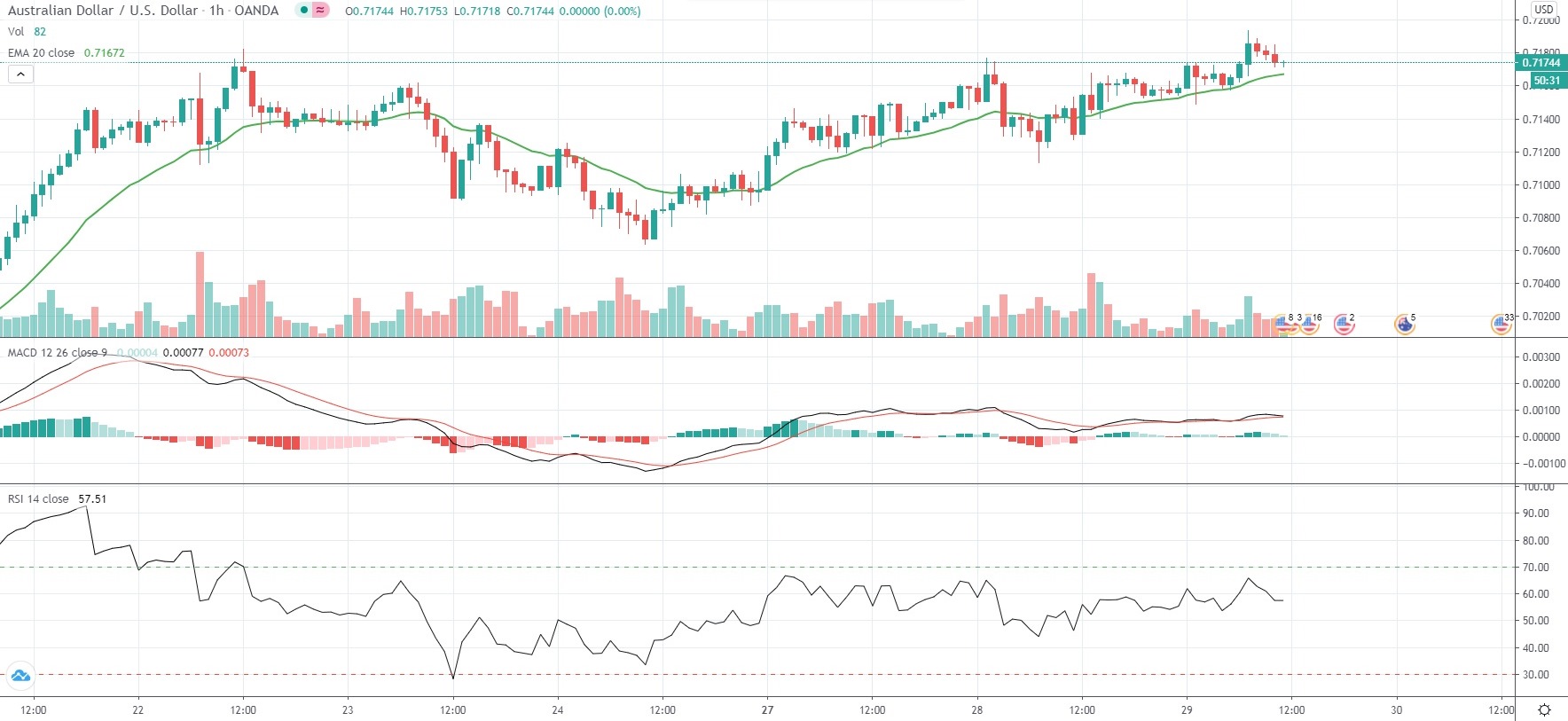 As of 11:15 GMT on Wednesday AUD/USD was edging up 0.19% to trade at 0.7171, after earlier touching an intraday high of 0.7194, or a level not seen since April 18th 2019 (0.7199). The major pair has risen 0.94% so far this week and looked set for a fourth consecutive month of gains.