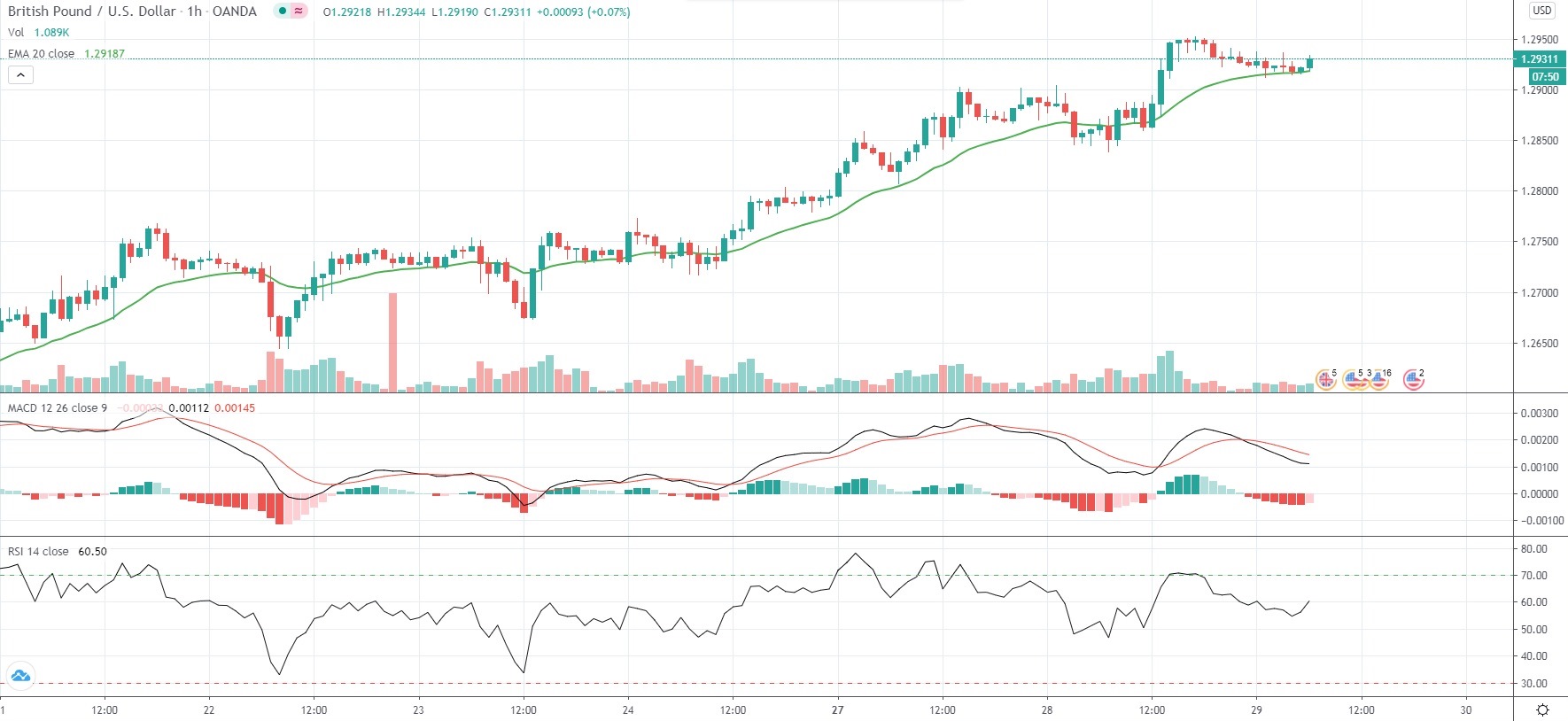 As of 7:05 GMT on Wednesday GBP/USD was edging up 0.12% to trade at 1.2947, while moving within a daily range of 1.2912-1.2948. Yesterday it climbed as high as 1.2953, or its strongest level since March 11th (1.2977). The major pair has risen 1.04% so far this week and looked set for its second straight month of gains and the best monthly performance since October 2019.