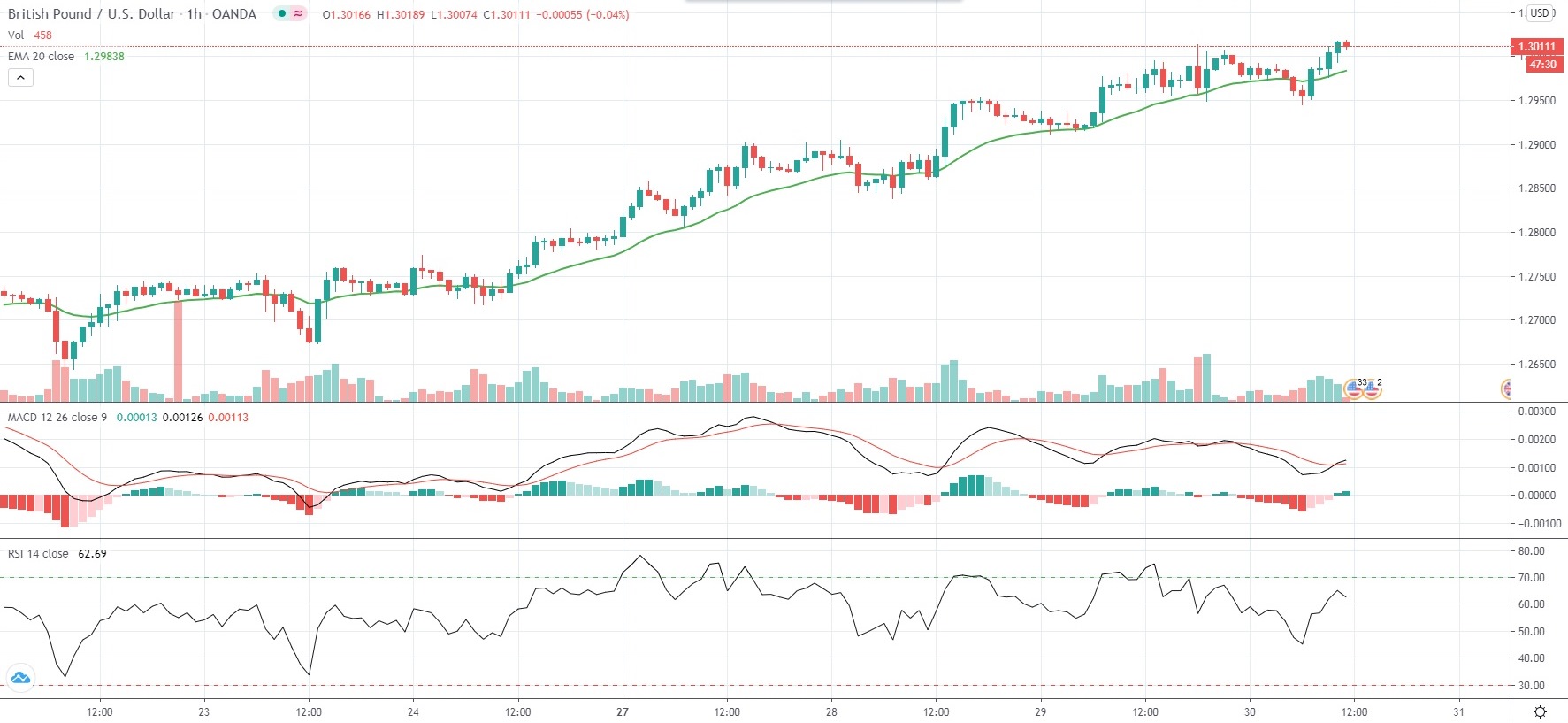 As of 11:10 GMT on Thursday GBP/USD was inching up 0.09% to trade at 1.3009, after earlier touching an intraday high of 1.3019, or a level not seen since March 10th (1.3124). The major pair has risen 1.68% so far this week and looked set for its second straight month of gains and the best monthly performance since October 2019.