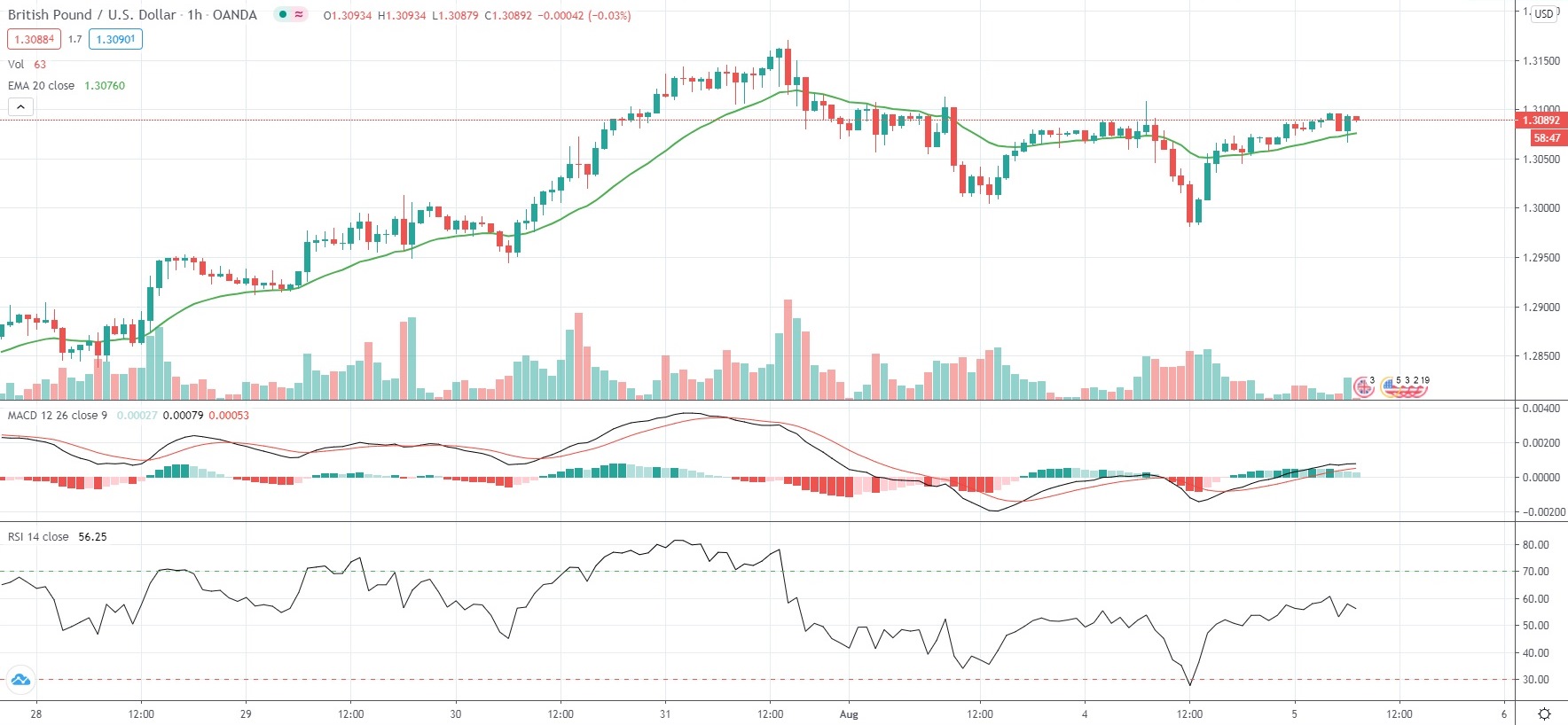 As of 6:55 GMT on Wednesday GBP/USD was edging up 0.14% to trade at 1.3089, while moving within a daily range of 1.3058-1.3097. Last Friday it climbed as high as 1.3170, or a level not seen since March 9th (1.3201). The major pair advanced 5.52% in July, while marking a second straight month of gains and its best monthly performance since May 2009. It has gained 0.04% so far this week.