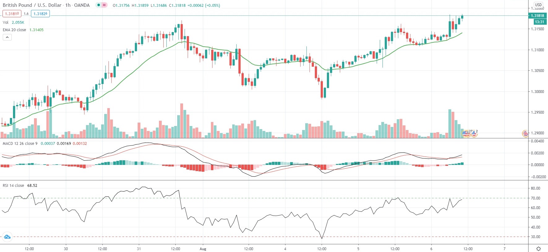As of 10:59 GMT on Thursday GBP/USD was edging up 0.43% to trade at 1.3171, after earlier touching an intraday high of 1.3186, or a level not seen since March 9th (1.3201). The major pair advanced 5.52% in July, while marking a second straight month of gains and its best monthly performance since May 2009. The pair has gained another 0.67% so far this week.