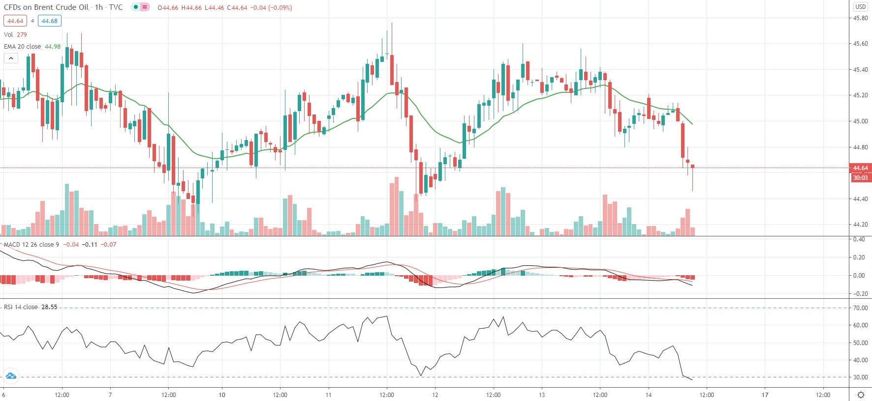 Brent Oil Futures were losing 1.11% on the day to trade at $44.54 per barrel, while moving within a daily range of $44.50-$45.21. Brent Oil Futures rose 4.86% in July, which marked their fourth consecutive month of advance. UK Oil has erased earlier gains for the week, now being down 0.18%.