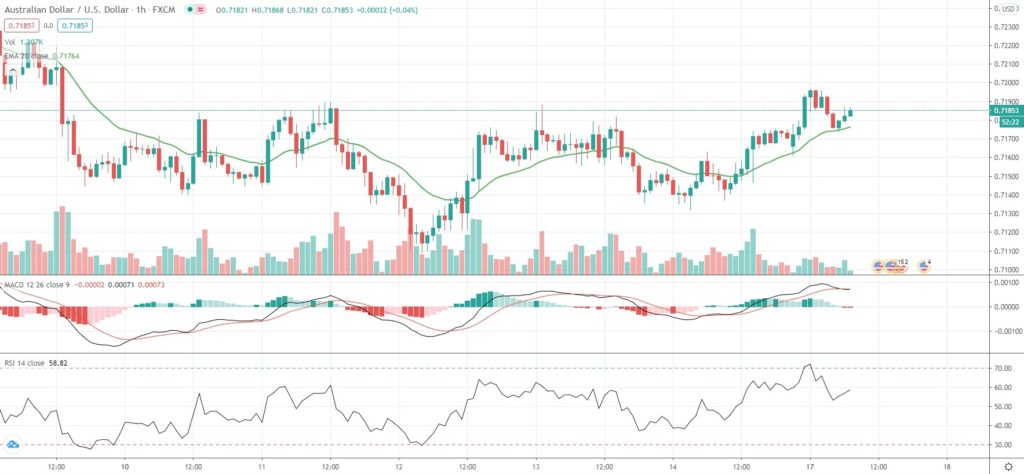 As of 7:02 GMT on Monday AUD/USD was edging up 0.21% to trade at 0.7185, after earlier touching an intraday high at 0.7196, or a level not seen since August 7th (0.7243). The major pair advanced 3.48% in July, which marked its fourth consecutive month of gains. The pair has risen another 0.65% so far this month.