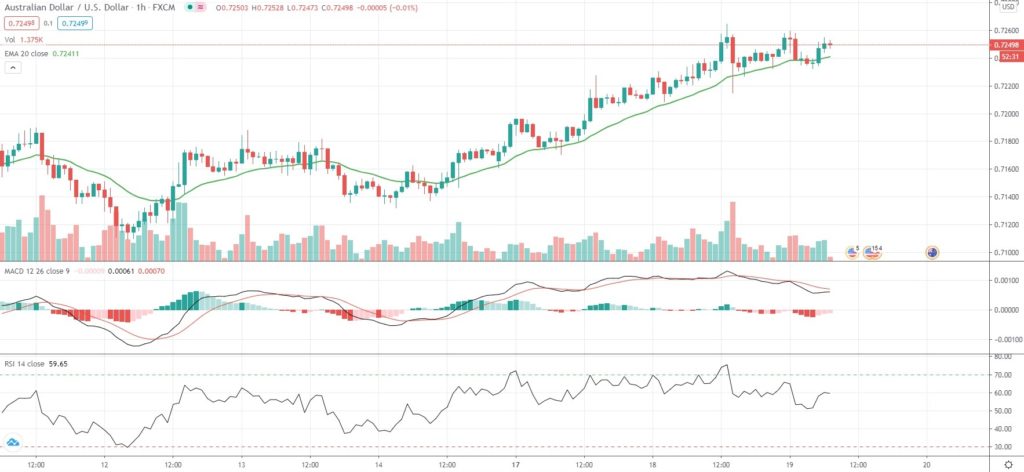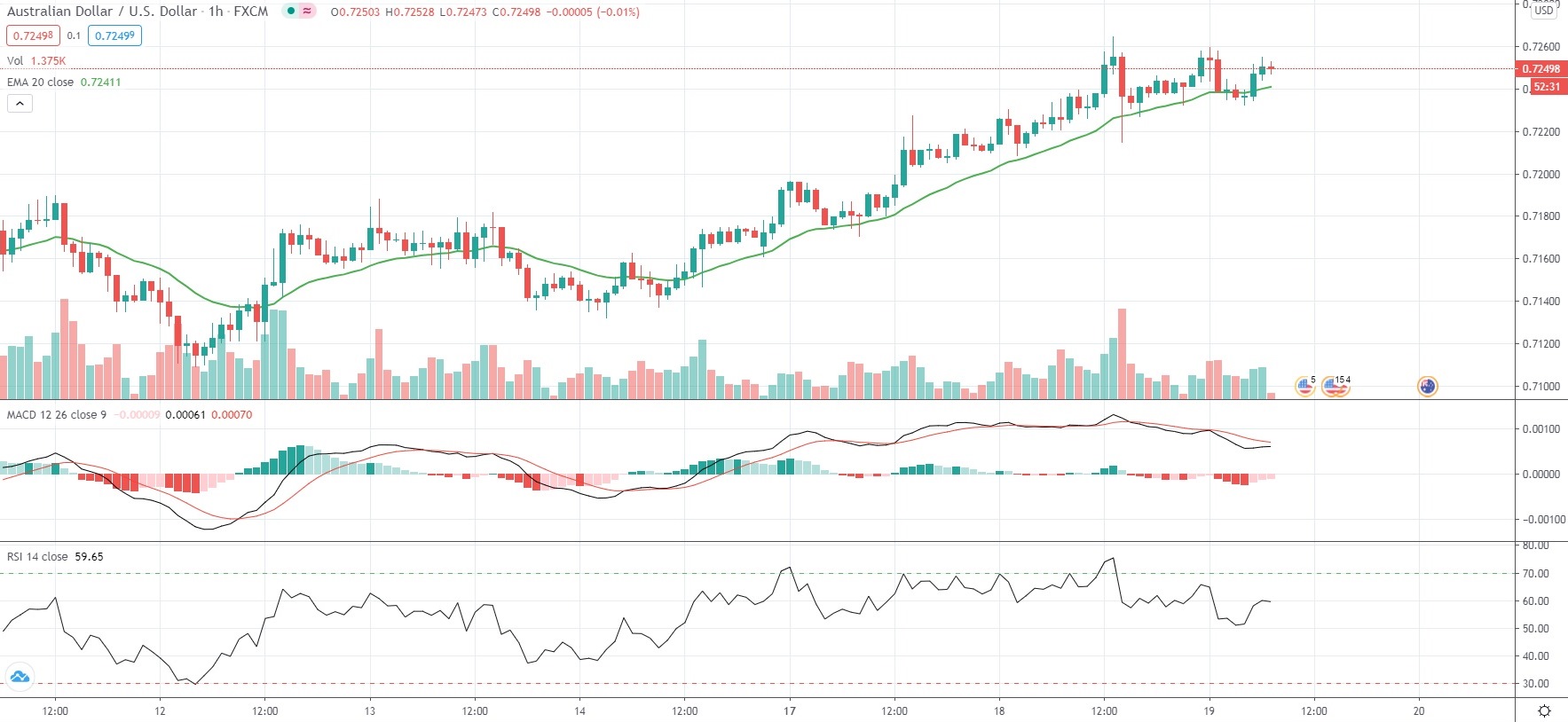 As of 7:04 GMT on Wednesday AUD/USD was edging up 0.12% to trade at 0.7251, while moving within a daily range of 0.7232-0.7260. Yesterday it climbed as high as 0.7265, its strongest level since February 5th 2019. The major pair advanced 3.48% in July, which marked its fourth consecutive month of gains. The pair has risen another 1.54% so far this month.