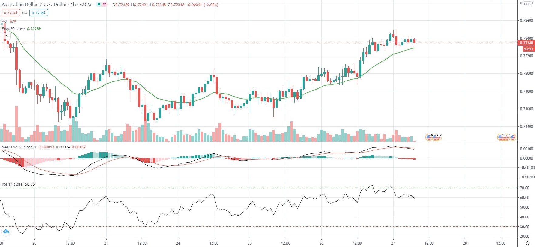 AUD/USD held steady in proximity to 2020 high of 0.7276 in early European session on Thursday as Australian business investment reportedly shrank at a lesser-than-anticipated rate in the second quarter, while market players were turning their attention to Fed Chairman Jerome Powell’s speech during the annual central bankers’ virtual conference for hints over a possible change in policy framework.