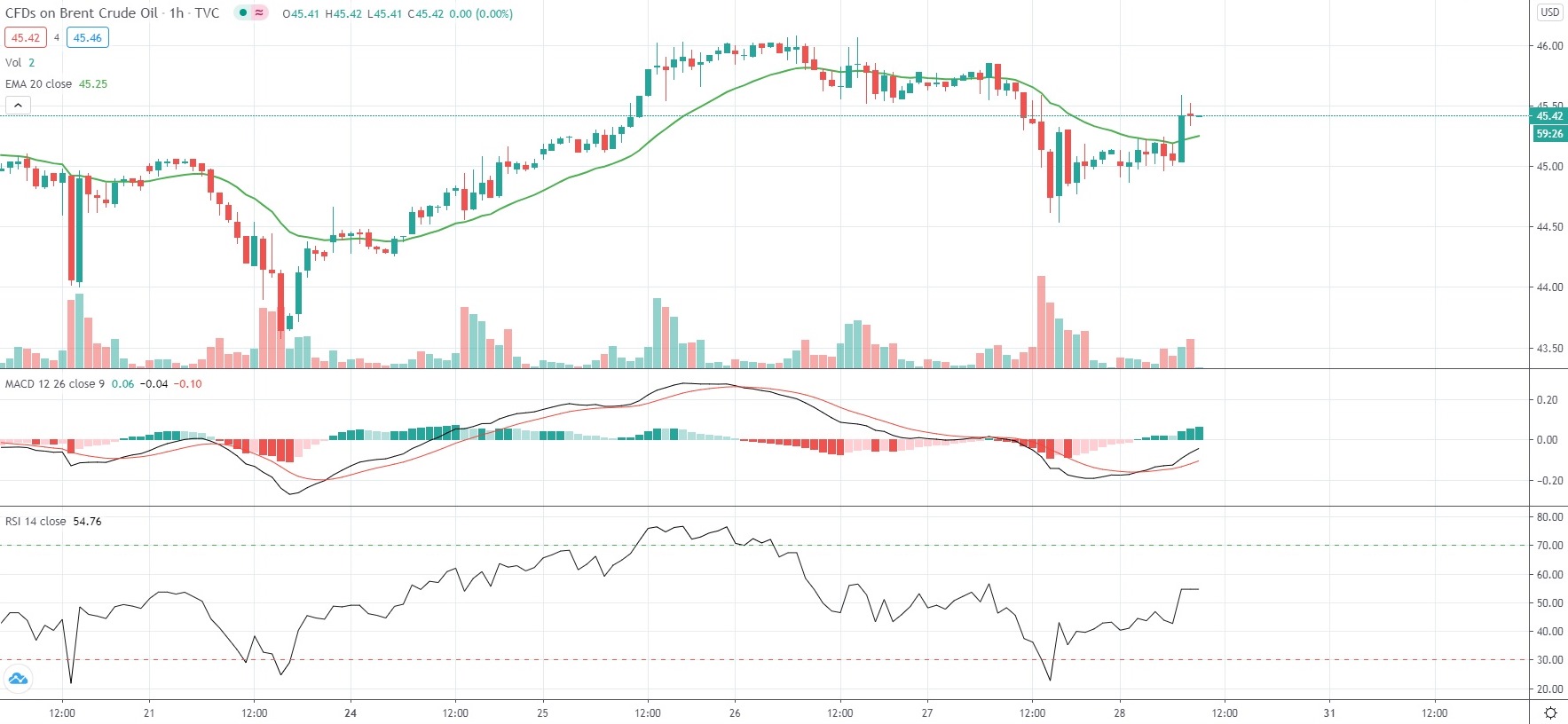 Brent Oil Futures were edging down 0.37% on the day to trade at $45.43 per barrel, while moving within a daily range of $45.34-$45.76. Brent Oil Futures have risen 4.17% so far in August, while being on track for a fifth straight month of gains.
