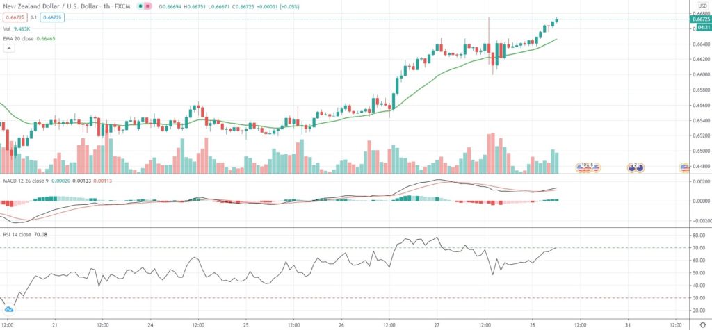 As of 6:54 GMT on Friday NZD/USD was gaining 0.53% to trade at 0.6673, after earlier touching an intraday high at 0.6675, or a level it achieved yesterday and also its strongest since August 7th (0.6691). The major pair has erased earlier losses for the month and is now up 0.74%, while being poised for a fifth straight monthly advance.