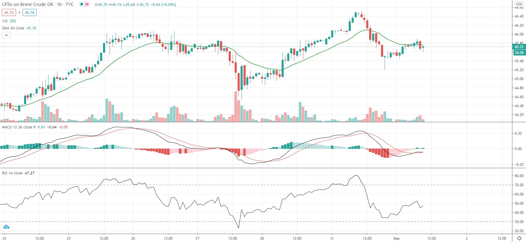 Brent Oil Futures were edging up 0.35% on the day to trade at $45.72 per barrel, while moving within a daily range of $45.50-$45.90. Brent Oil Futures rose 4.45% in August, while marking their fifth straight month of gains.
