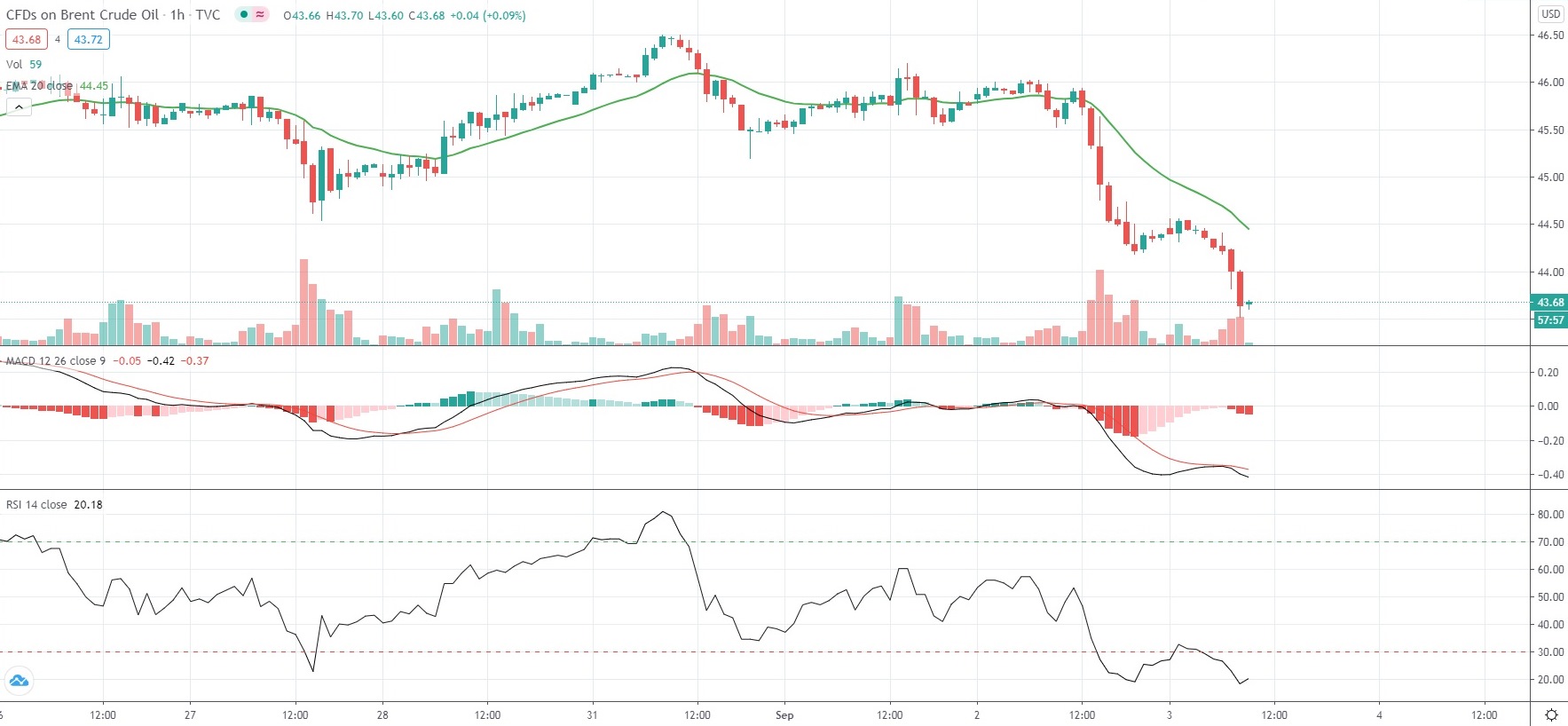 Brent Oil Futures were retreating 1.73% on the day to trade at $43.62 per barrel, after earlier touching an intraday low at $43.56, or a price level not seen since August 4th ($43.26). Brent Oil Futures rose 4.45% in August, while marking their fifth straight month of gains.