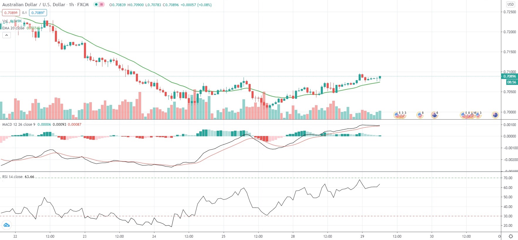 As of 6:54 GMT on Tuesday AUD/USD was edging up 0.33% to trade at 0.7092, after earlier touching an intraday high of 0.7096, or a level not seen since September 23rd (0.7177). The major pair has retreated 3.90% so far in September, following five consecutive months of gains.