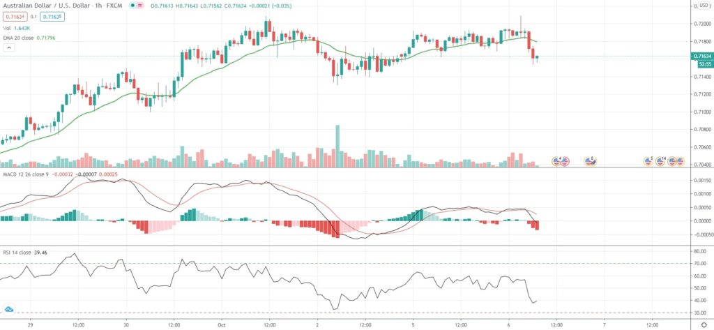 As of 7:02 GMT on Tuesday AUD/USD was edging down 0.31% to trade at 0.7156, after earlier touching an intraday high of 0.7209, or a level not seen since October 1st (0.7209). The major pair has dipped 0.04% so far in October, after retreating 2.91% in September, its first monthly loss since March.