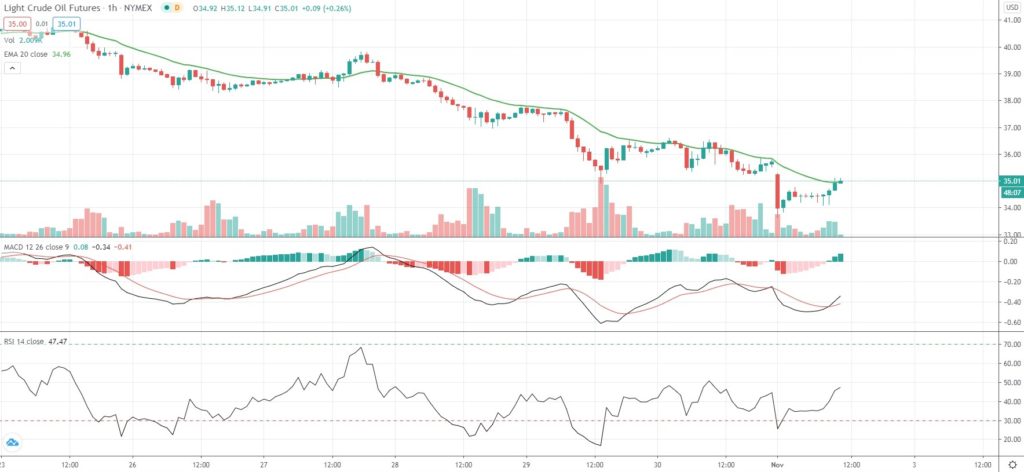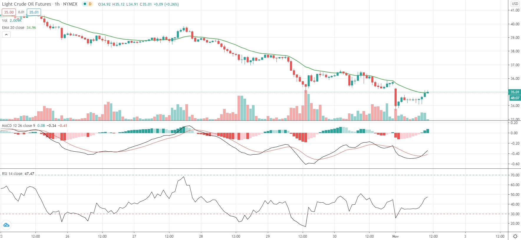 As of 10:18 GMT on Monday WTI Crude Oil Futures were retreating 2.18% to trade at $35.01 per barrel, after earlier touching an intraday low of $33.64 per barrel, or a price level not seen since May 29th ($32.36).