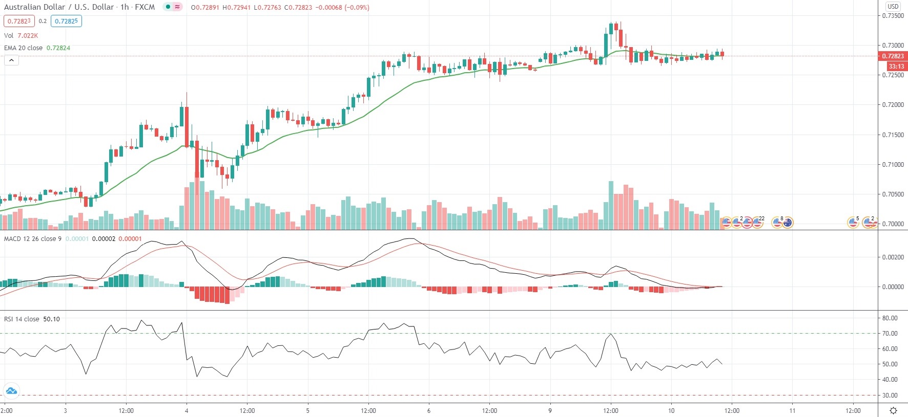 As of 10:25 GMT on Tuesday AUD/USD was inching up 0.07% to trade at 0.7282, while moving within a daily range of 0.7266-0.7295. Yesterday it climbed as high as 0.7340, or its strongest level since September 16th (0.7345). The major pair has risen 3.73% so far in November, after retreating 1.87% in October.