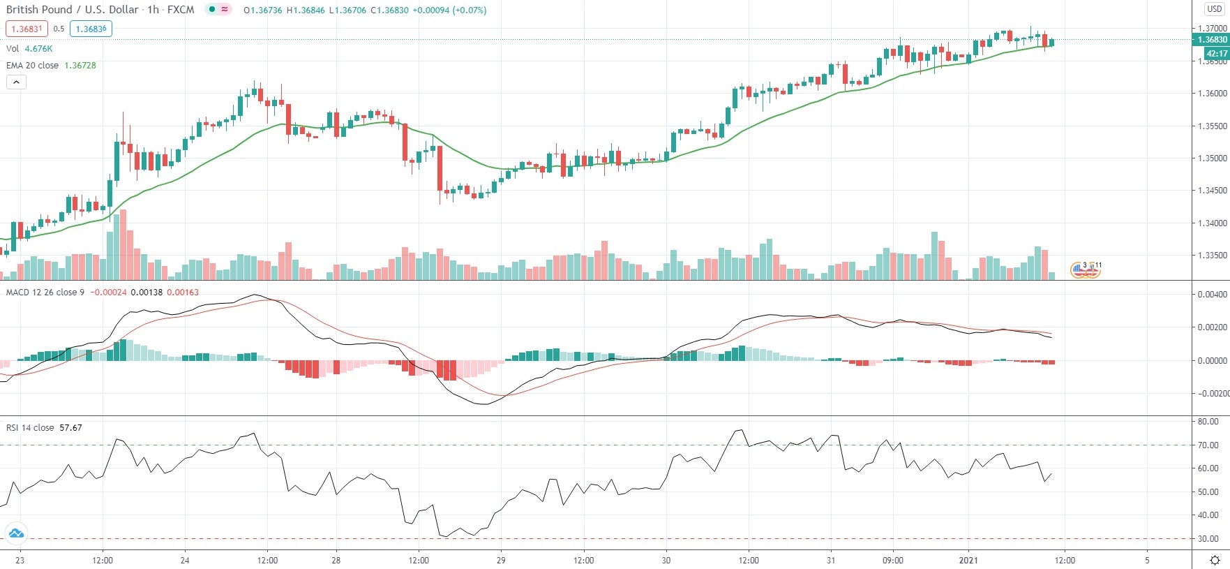 As of 10:12 GMT on Monday GBP/USD was edging up 0.18% to trade at 1.3681, after earlier touching an intraday high of 1.3703, or its strongest level since May 1st 2018 (1.3773). The major pair advanced for a third straight month in December, by 2.54%.