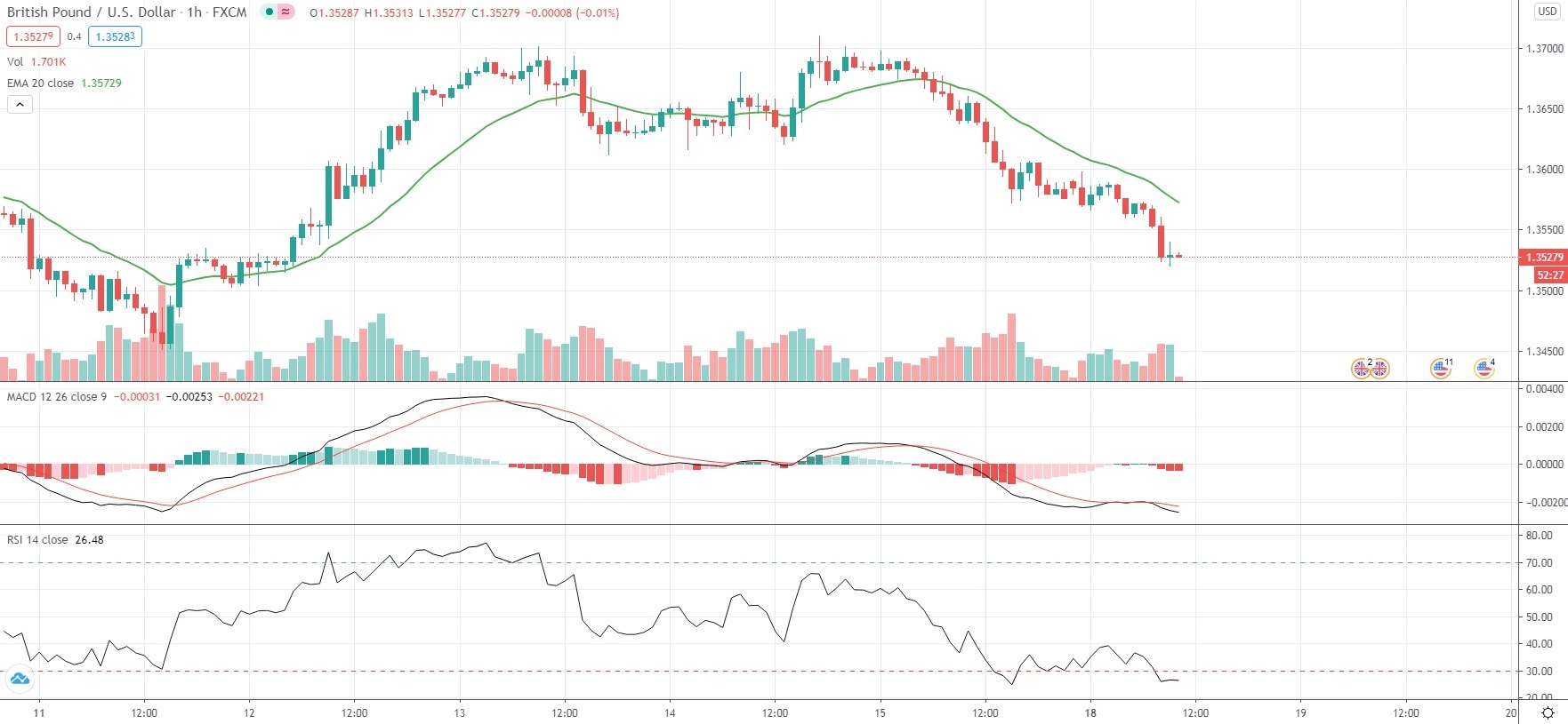 As of 10:07 GMT on Monday GBP/USD was edging down 0.35% to trade at 1.3529, after earlier touching an intraday low of 1.3520, or its weakest level since January 12th (1.3503). The major pair has retreated 0.94% so far in January, following a 2.54% surge in December.