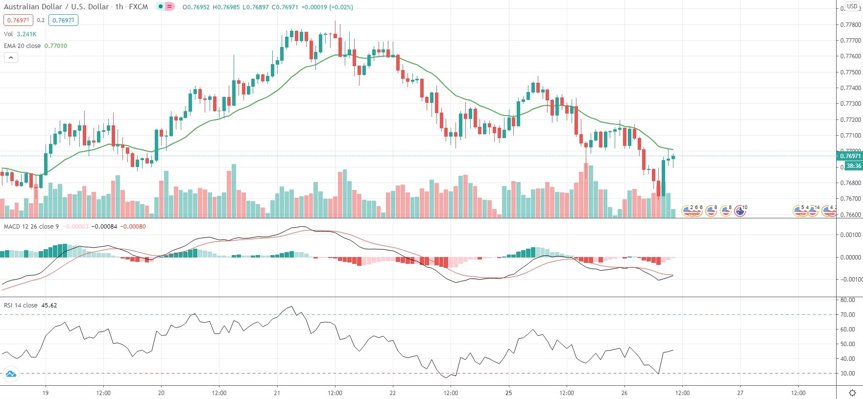 As of 10:16 GMT on Tuesday AUD/USD was edging down 0.19% to trade at 0.7698, after earlier touching an intraday low of 0.7669, or its weakest level since January 18th (0.7659). The major pair has inched down 0.05% so far in January, following a 4.89% surge in December, or the biggest monthly gain since April 2020.