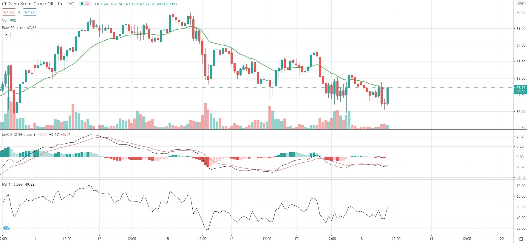 Brent Oil Futures were inching down 0.07% on the day to trade at $67.70 per barrel, while moving within a daily range of $67.10-$68.04 per barrel. Brent Oil Futures have risen 5.12% so far in March, following a 17.09% surge in February.