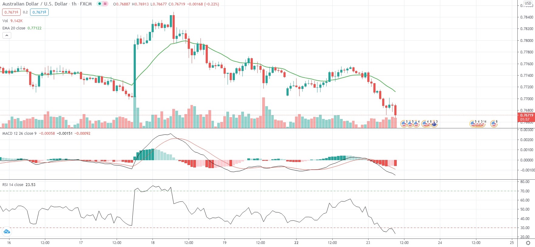 As of 9:51 GMT on Tuesday AUD/USD was retreating 0.96% to trade at 0.7670, after earlier touching an intraday low of 0.7669, or its weakest level since March 10th (0.7668). The currency pair has edged down 0.43% so far in March, following a 0.88% surge in February.