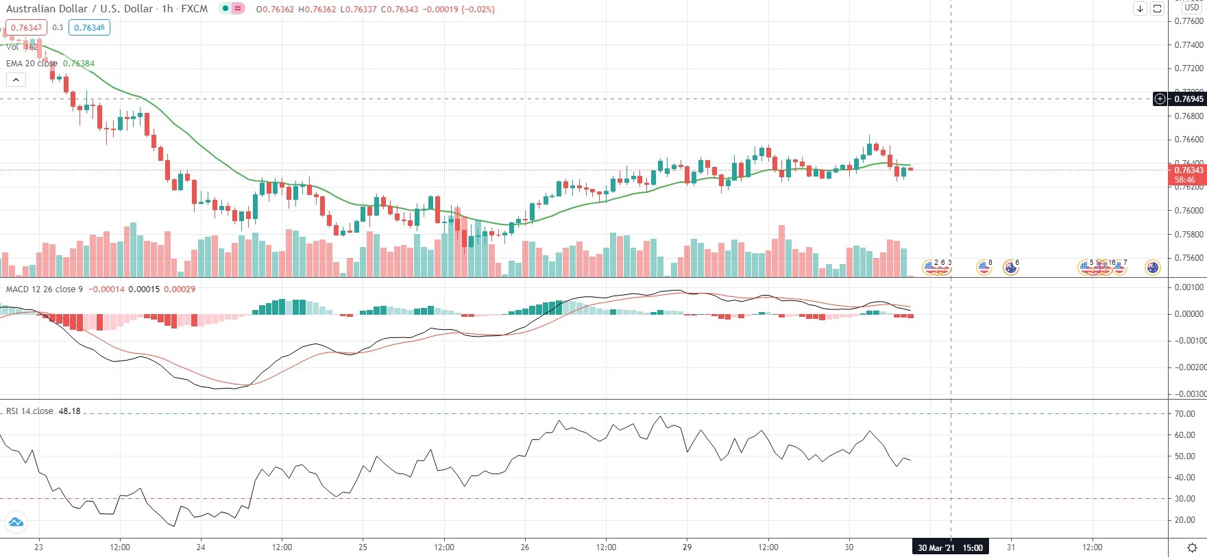 As of 8:57 GMT on Tuesday AUD/USD was edging up 0.11% to trade at 0.7636, after earlier touching an intraday high of 0.7664, or its strongest level since March 23rd (0.7747). The currency pair has retreated 0.90% so far in March, following a 0.88% surge in February.