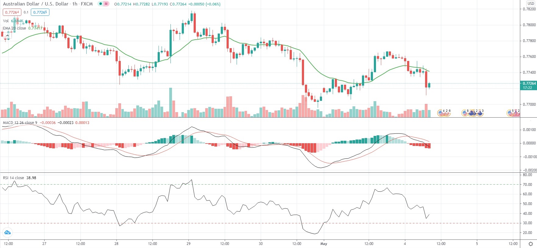 As of 8:34 GMT on Tuesday AUD/USD was retreating 0.42% to trade at 0.7726, while moving within a daily range of 0.7712-0.7763. Last Thursday the pair climbed as high as 0.7818, or its strongest level since March 18th (0.7849). The major currency pair appreciated 1.53% in April, which marked its best monthly performance since December 2020.