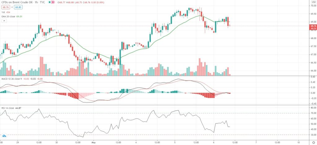 Brent Oil Futures were edging up 0.29% on the day to trade at $68.72 per barrel, while moving within a daily range of $68.36-$69.34 per barrel. Yesterday Brent Oil rose as high as $69.92, or its strongest price level since March 15th ($70.00 per barrel). Brent Oil Futures have risen 3.25% so far in May, following another 5.74% surge in April.