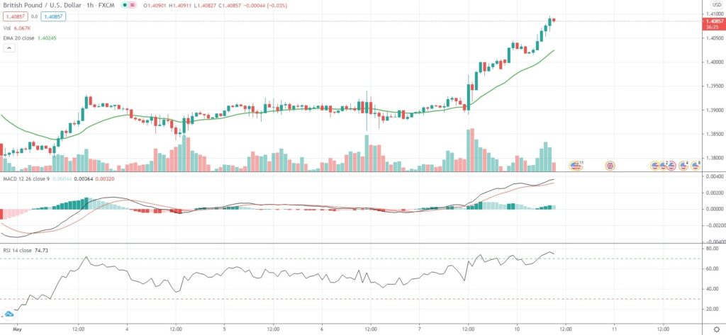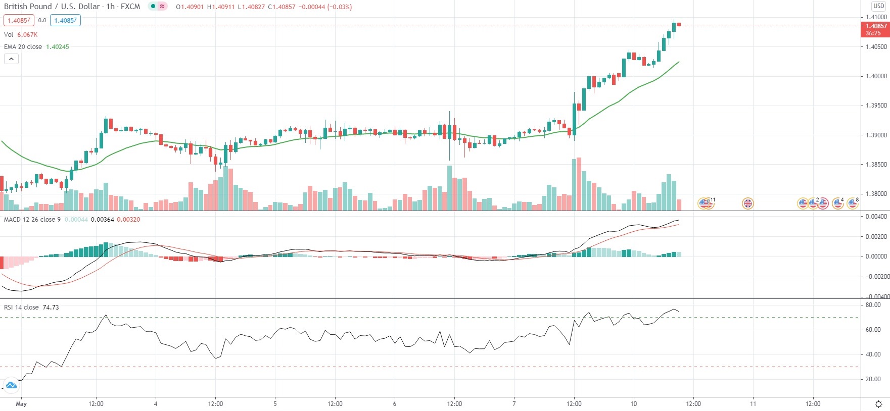 As of 9:21 GMT on Monday GBP/USD was gaining 0.72% to trade at 1.4087, after earlier touching an intraday high at 1.4096, or its strongest level since February 25th (1.4182). The major currency pair has risen 1.96% so far in May, following another 0.28% gain in April.