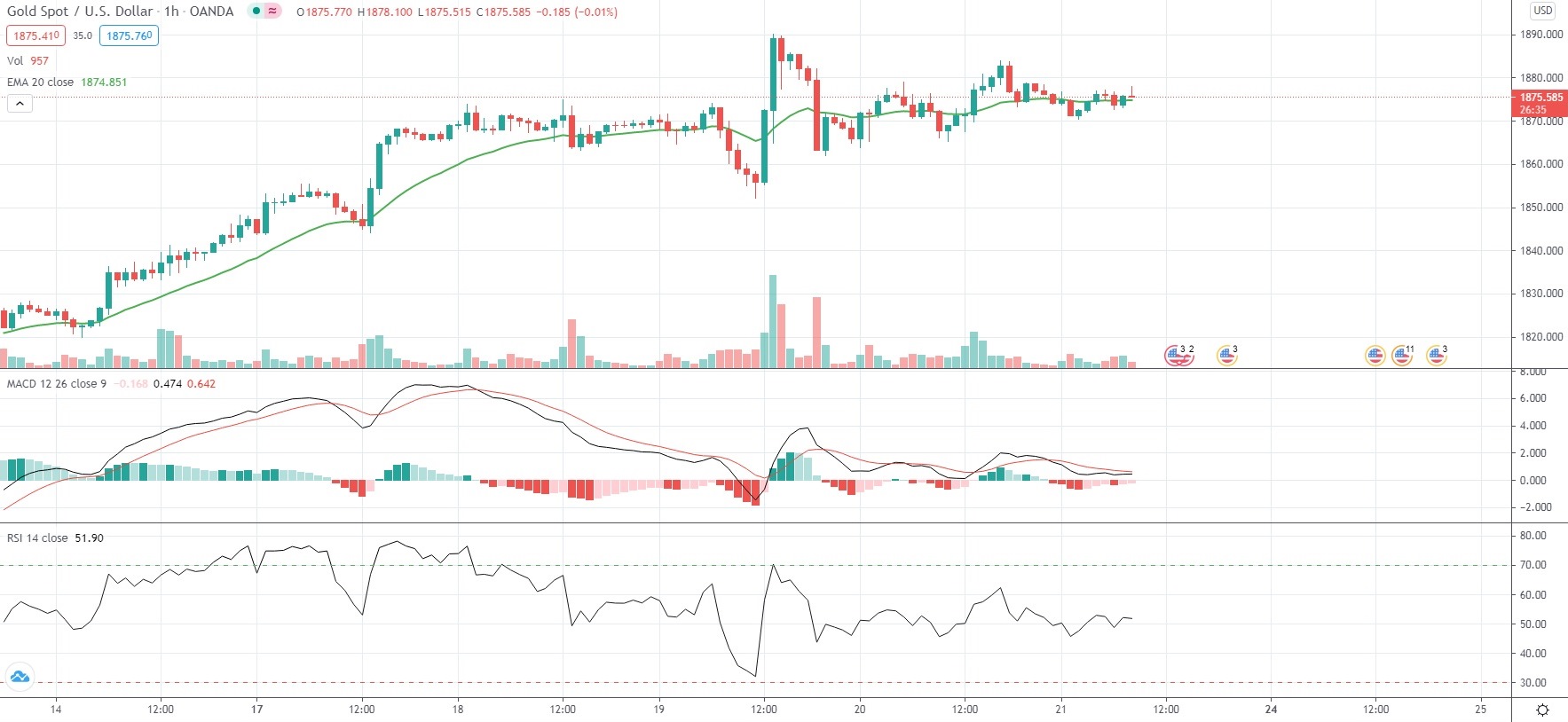 As of 8:31 GMT on Friday Spot Gold was inching down 0.05% to trade at $1,876.15 per troy ounce, while holding close to Wednesday’s high of $1,890.14, also its strongest price level since January 8th ($1,917.54 per troy ounce).