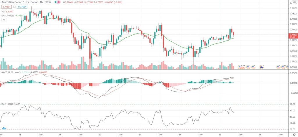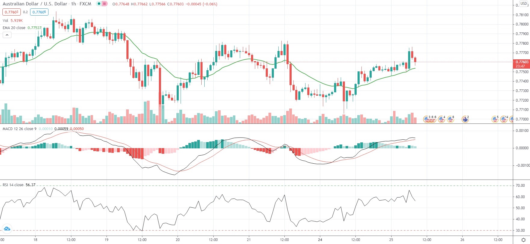 As of 8:30 GMT on Tuesday AUD/USD was edging up 0.14% to trade at 0.7762, while moving within a daily range of 0.7746-0.7776. The major currency pair has gained 0.67% so far in May, following another 1.53% surge in April.