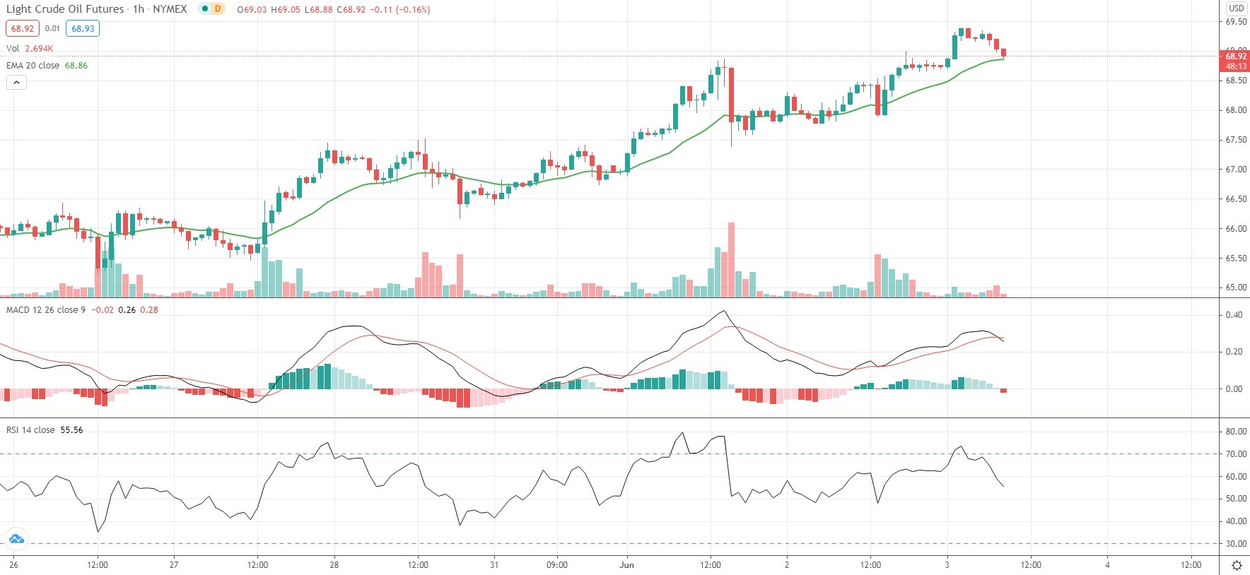 As of 8:21 GMT on Thursday WTI Crude Oil Futures were edging up 0.15% to trade at $68.93 per barrel, after earlier touching an intraday high at $69.40. The latter has been WTI Crude’s strongest price level since October 23rd 2018 ($69.66 per barrel). WTI Crude Oil Futures have risen 4.01% so far in June, following another 4.31% surge in May.