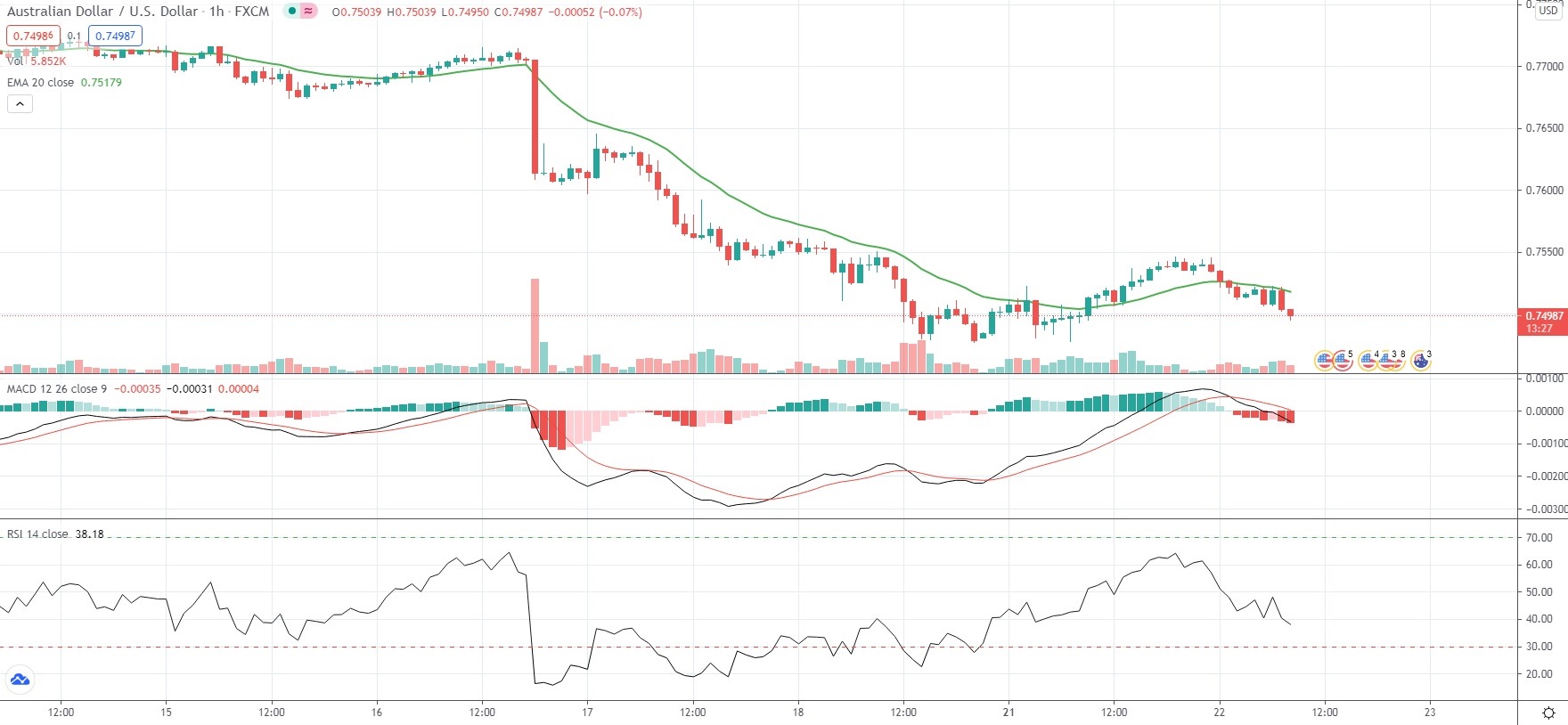 As of 8:36 GMT on Tuesday AUD/USD was edging down 0.50% to trade at 0.7497, while moving within a daily range of 0.7495-0.7545. Last Friday the pair slipped as low as 0.7477, which has been its weakest level since December 21st 2020 (0.7462). The major currency pair has retreated 2.98% so far in June, following a 0.26% gain in May.