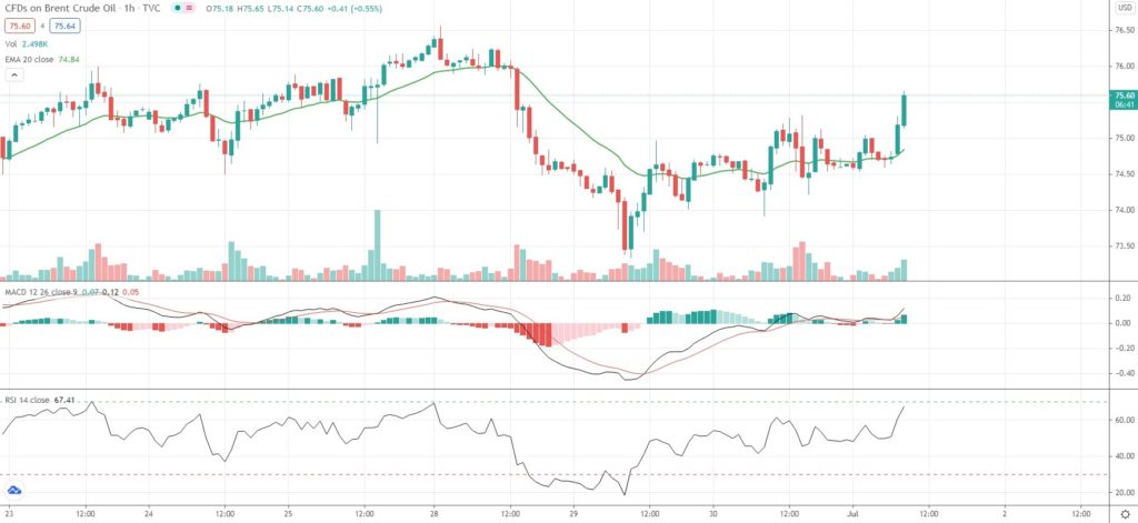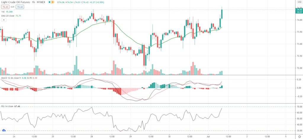 As of 8:37 GMT on Thursday WTI Crude Oil Futures were gaining 1.14% to trade at $74.31 per barrel, after earlier touching an intraday high at $74.54 per barrel. The latter has been the black liquid’s strongest price level since October 10th 2018 ($75.08 per barrel). WTI Crude Oil Futures surged 10.78% in June, or the most since February.