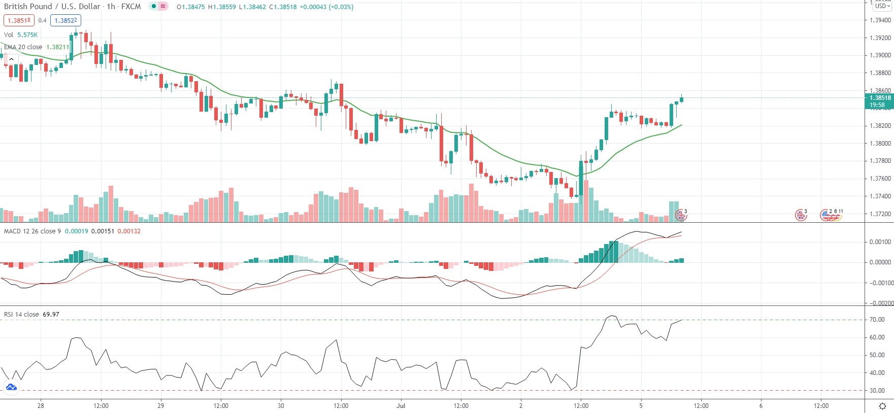 As of 8:35 GMT on Monday GBP/USD was edging up 0.20% to trade at 1.3852, while moving within a daily range of 1.3817-1.3856. Last Friday the pair slipped as low as 1.3731, which has been its weakest level since April 16th (1.3716). The major currency pair has gained 0.16% so far in July, following a 2.66% drop in June.