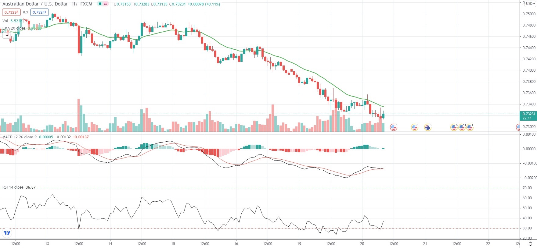 As of 8:33 GMT on Tuesday AUD/USD was edging down 0.23% to trade at 0.7325, after earlier touching an intraday low at 0.7311. The latter has been the Forex pair’s weakest level since November 24th 2020 (0.7283). The major currency pair has retreated 2.30% so far in July, following another 2.99% drop in June.